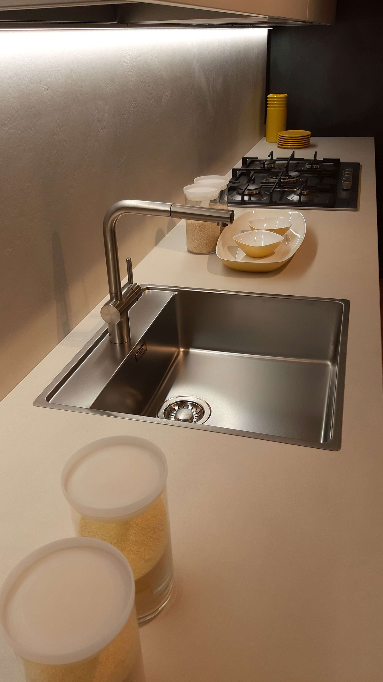 CUCINA DALLA LINEA SEMPLICE ED ELEGANTE, CARATTERIZZATA DAL BLOCCO OPERATIVO IN CERAMICA E DAI PENSILI ALTI E CAPIENTI.