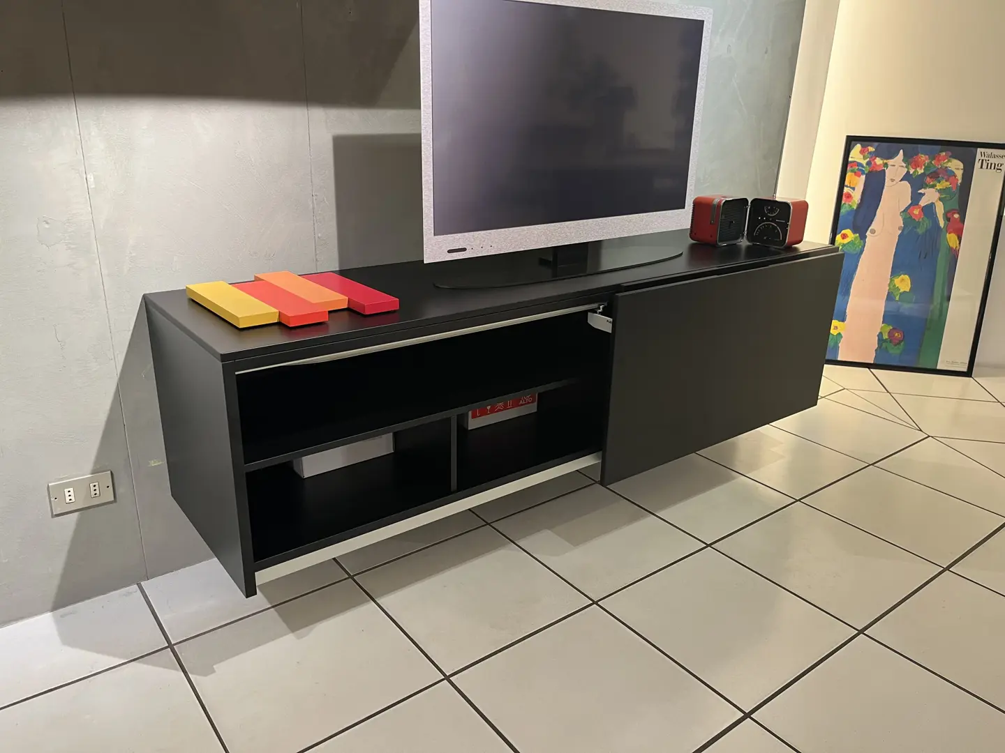 Composizione funzionale e di design pensata per arredare con eleganza la zona giorno. Studiata per dare vita ad un soggiorno operativo pratico. Modulo sospeso cm. L. 180 P. 47 H. 47 con anta scorrevole "a filo" tutto laccato opaco nero Carbone. Elemento superiore con anta a ribalta cm. L. 240 P. 35 H. 38 con anta e fianchi laccato opaco Roccia