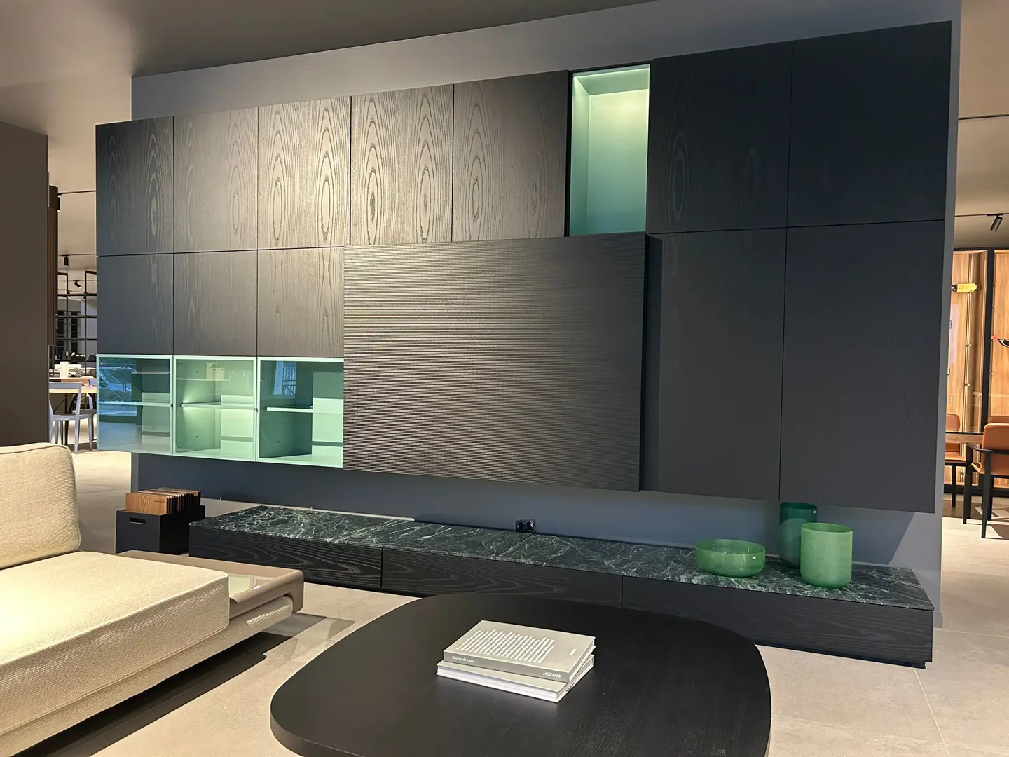 A completare l'insieme, tre moduli a terra con top in marmo verde rameggiato, che donano un ulteriore livello di sofisticatezza al design complessivo. La finitura in frassino tinto nero aggiunge profondità e calore, rendendo questo soggiorno componibile una scelta ideale per chi cerca stile e funzionalità.