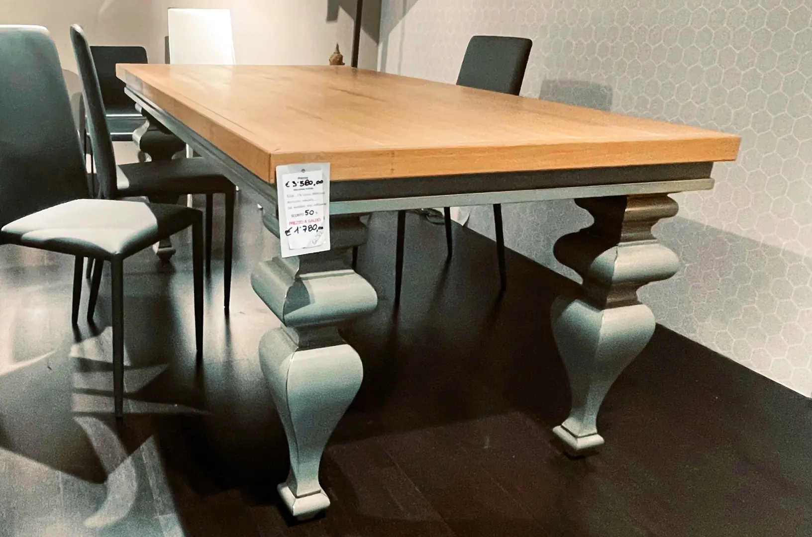 Tavolo fisso 200x100 in massello Rovere Naturale con gambe in laccato opaco anticato grigio.