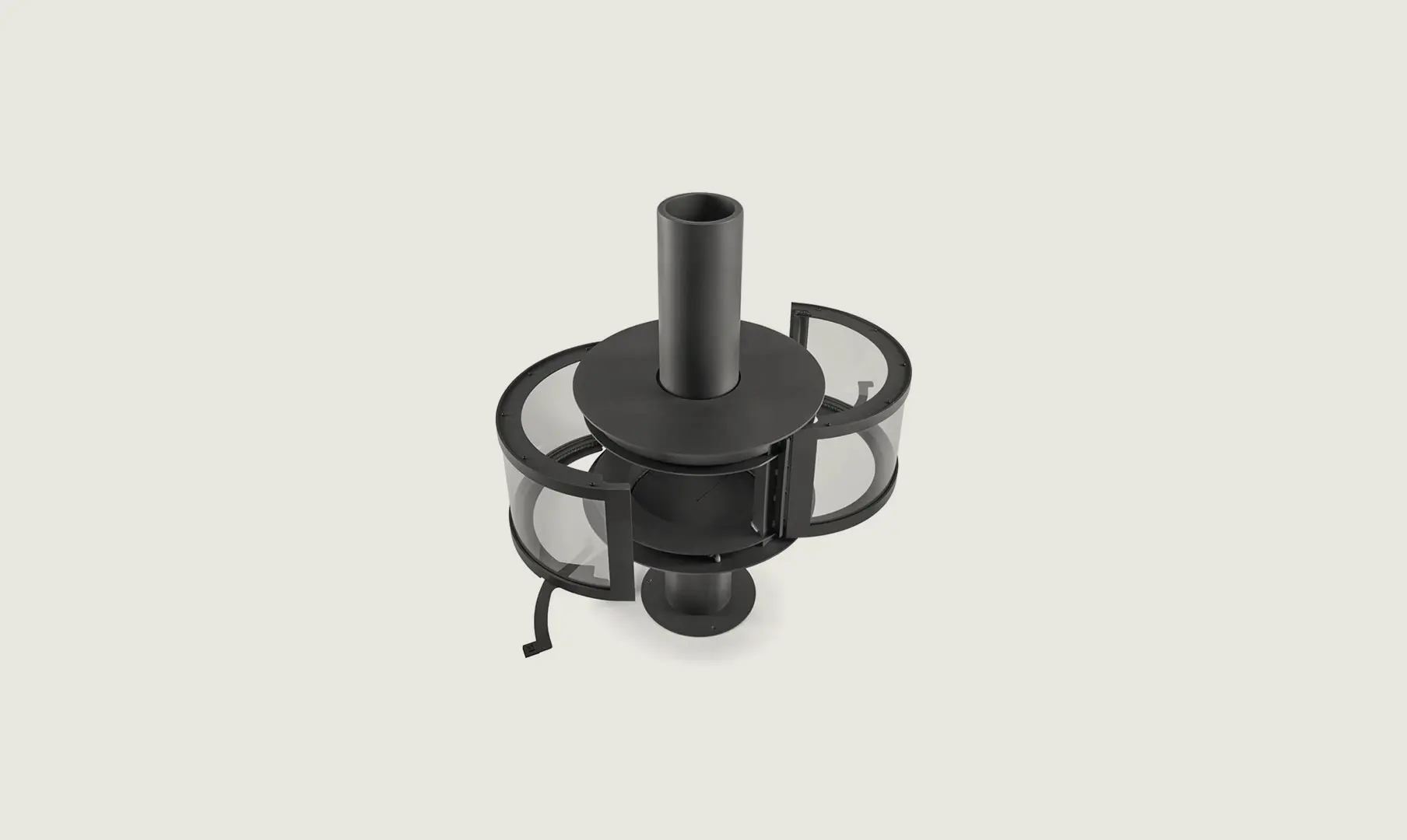 Il caminetto Ronde Central di Rocal è un focolare centrale a legna con struttura circolare che permette una visione completa delle fiamme a 360 gradi. Progettato per essere protagonista dello spazio, unisce funzione e presenza scenica, con la possibilità di installazione su piedistallo o in versione sospesa. Le porte in vetroceramica ad apertura bilaterale resistono alle alte temperature, mantenendo al contempo trasparenza e sicurezza. La verniciatura anticalorica, antifumo e antiodore protegge la struttura nel tempo. Con una potenza di 13 kW e un rendimento superiore all’87%, garantisce performance termiche efficienti con consumi contenuti (3,4 kg/h). Il focolare accoglie ceppi fino a 33 cm, offrendo una buona autonomia. L’installazione, pensata per ambienti di ampio respiro, trasforma ogni stanza in uno spazio conviviale e accogliente. Rocal è un’azienda spagnola con oltre trent’anni di esperienza nella produzione di caminetti e stufe, specializzata in soluzioni di design ad alte prestazioni termiche.
