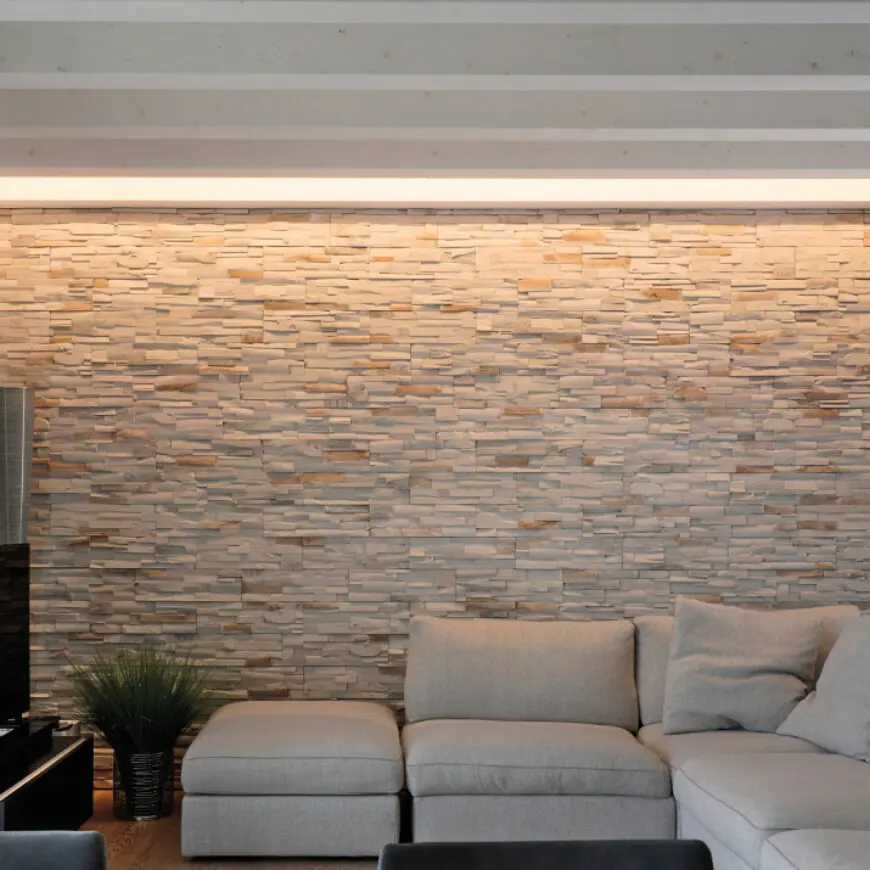 Teakstone è un rivestimento in Biopietra che si ispira all’eleganza del legno ma ne traduce l’estetica in chiave minerale. Le sue forme allungate, affiancate con precisione, creano una superficie scandita e ordinata, capace di evocare calore e naturalezza con un tocco contemporaneo. Il ritmo regolare dei listelli dona profondità alla parete, esaltandone la verticalità o l’orizzontalità a seconda della posa. La finitura superficiale, ricca di dettagli materici, contribuisce a un effetto visivo raffinato e originale. Biopietra è un materiale ecologico composto da elementi naturali, pensato per unire l’estetica della pietra a elevate prestazioni tecniche. È traspirante, atossico e certificato per la bioedilizia, ideale per progetti sostenibili e salubri.